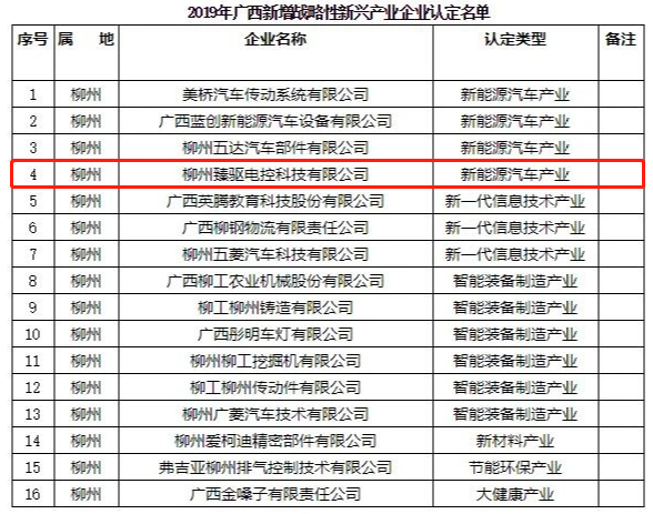 2020年5月,廣西壯族自治區(qū)新興產(chǎn)業(yè)發(fā)展辦公室發(fā)布了《關(guān)于公布2019年廣西新增戰(zhàn)略性新興產(chǎn)業(yè)企業(yè)認(rèn)定名單的通知》,認(rèn)定全區(qū)103家企業(yè)為2019年廣西新增戰(zhàn)略性新興產(chǎn)業(yè)企業(yè),作為電機(jī)控制器及其核心零部件產(chǎn)品研發(fā)、生產(chǎn)和銷售為一體的新能源動力總成核心零部件供應(yīng)商,柳州臻驅(qū)成功入圍該批戰(zhàn)略性新興企業(yè)認(rèn)定。
