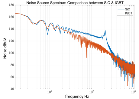 圖2 重復性脈沖頻譜對比,相較IGBT可看到由于SiC高速開關帶來的MHz級幅值抬升,以及振蕩帶來的20MHz左右頻譜尖峰
